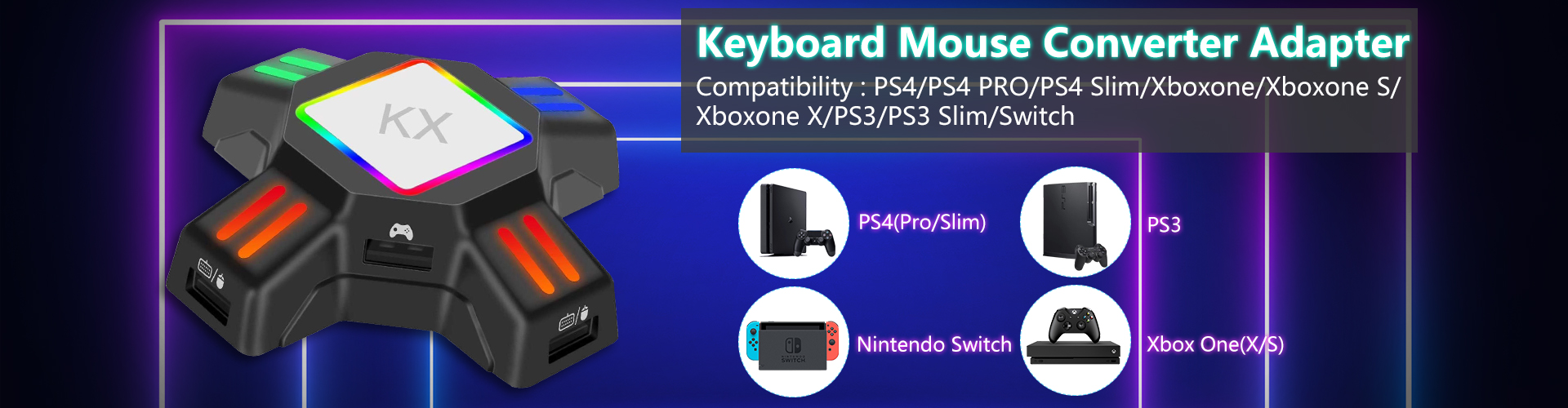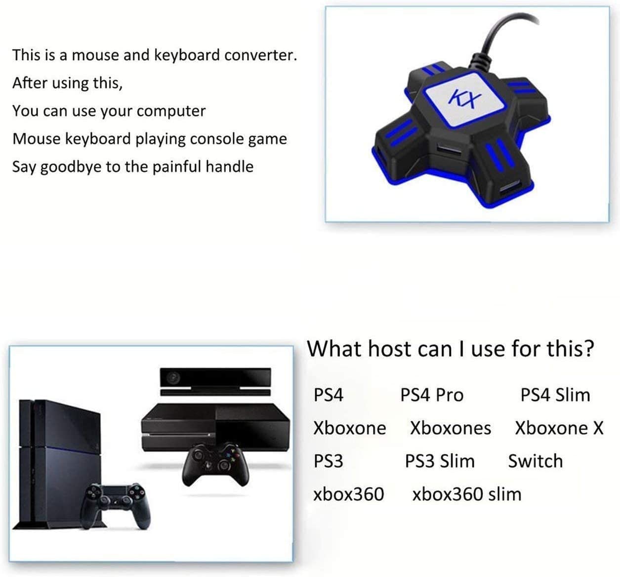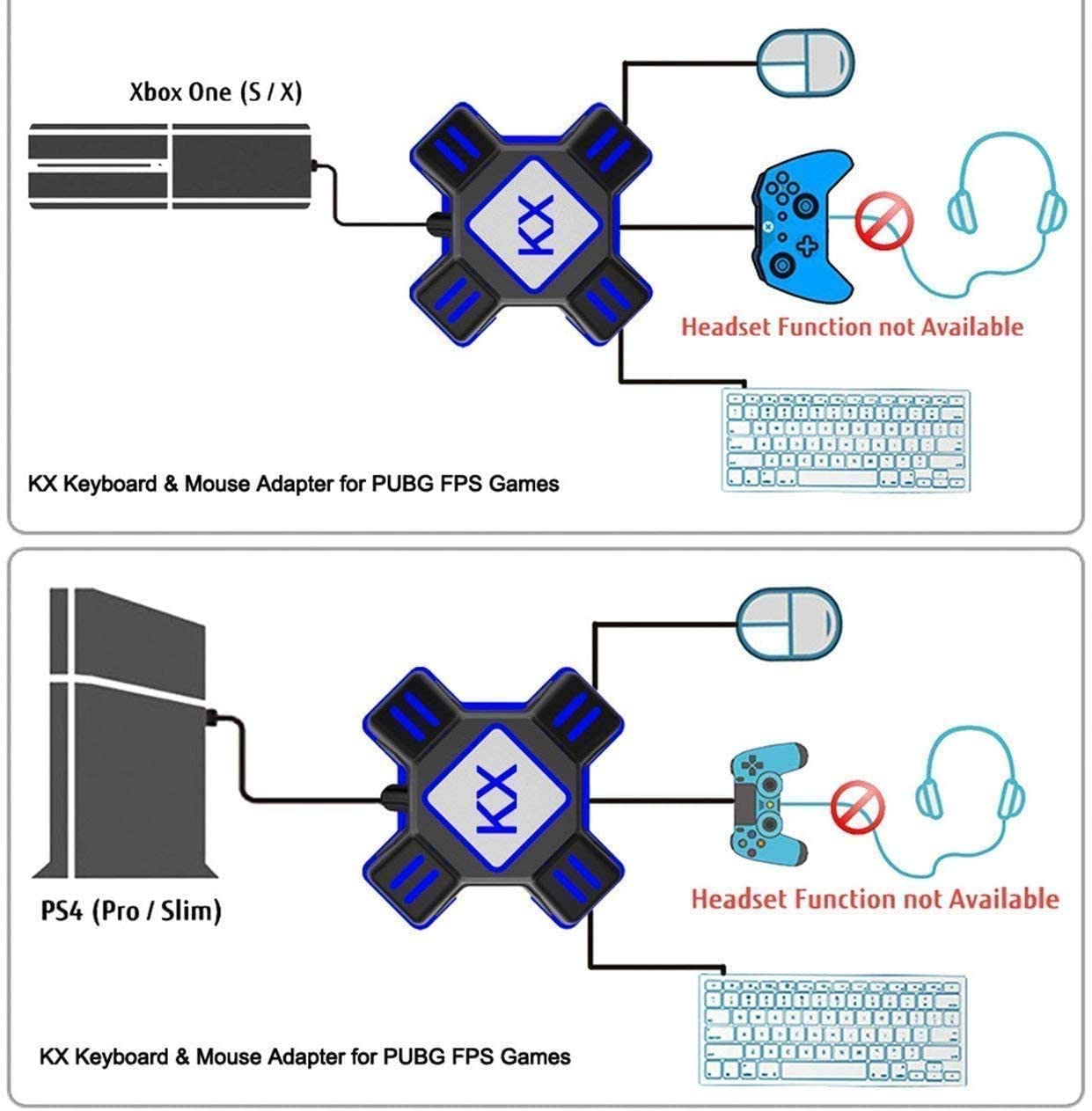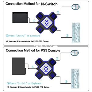 ![]() Mit PS4 (Pro/Slim)/Xbox ONE (X/S) verbinden1. Schließen Sie den Adapter über das mitgelieferte USB-Kabel an die Konsole an, die LED leuchtet grün auf. 2. Schließen Sie die USB-Tastatur und -Maus an den entsprechenden Adapteranschluss an, die LED leuchtet rot auf. 3. Schalten Sie den ursprünglichen Controller aus. Schließen Sie den Original-Controller über ein USB-Datensynchronisierungskabel an den Adapter an, die LED leuchtet blau und zeigt an, dass die Verbindung erfolgreich ist. Hinweis:1. Das verwendete Original-Controller-USB-Kabel muss das Lade- und Datensynchronisierungskabel sein 2. Stellen Sie sicher, dass Sie eine Verbindung mit dem originalen PS4/Xbox ONE-Controller herstellen, Controller von Drittanbietern werden derzeit nicht unterstützt. 3. Der Controller muss vor dem Anschließen ausgeschaltet werden. |